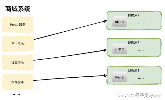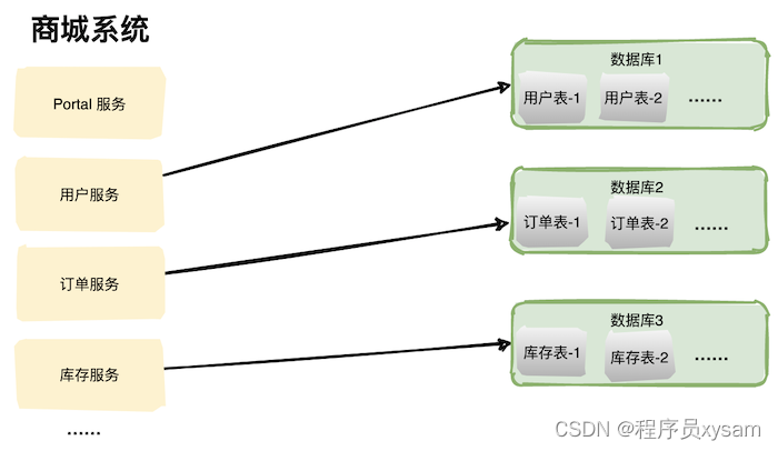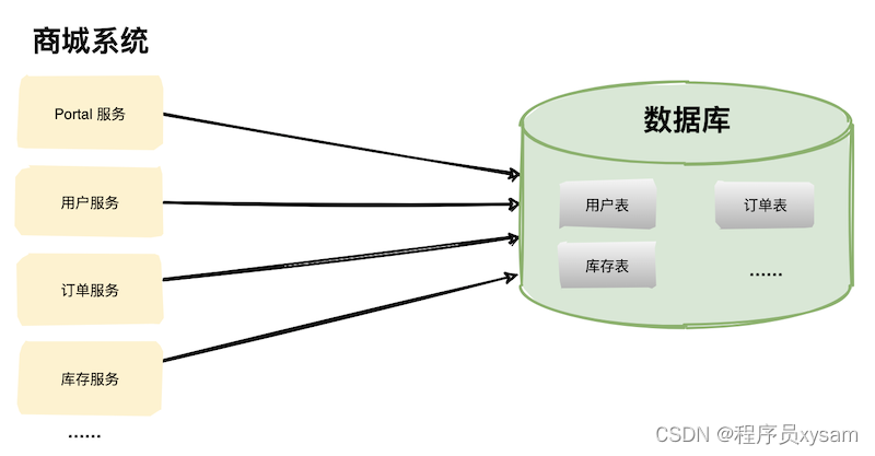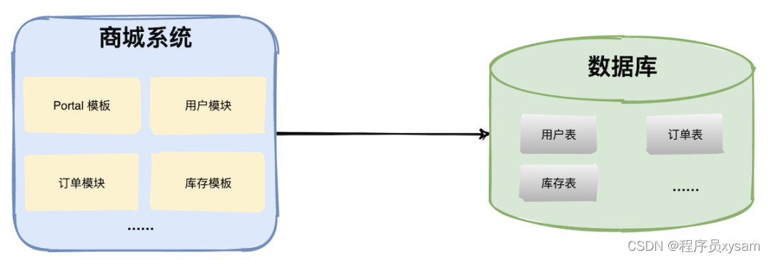 如上图,商城系统包括主页 Portal 模板、用户模块、订单模块、库存模块等,所有的模块都共有一个数据库,通常数据库中有非常多的表。