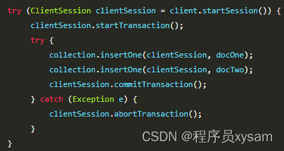 MongoDB 的事务接口非常简单,开发者只需要将需要保证原子性的更新序列放到一个 session 的 开始事务 与提交事务之间即可。下面是 Java 使用 MongoDB 事务的示例代码: