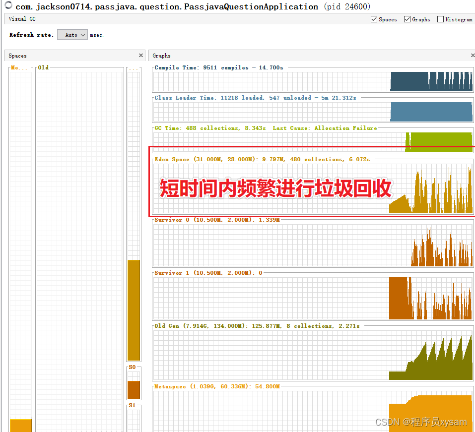 我们可以通过 jvisulavm工具查看垃圾回收的情况,Eden 区频繁发生 GC,短时间(1分钟)内共造成了 480 次 stop the world。另外从压测工具中也可以看到,吞吐量为 275/s。