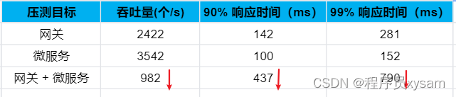 说明微服务 api 经过网关转发一次后,性能至少下降了一半。可以得出结果:中间件越多,性能损失越大,大部分损失都是网络交互导致的。可以通过增强网络通信质量来减少网络的延迟。