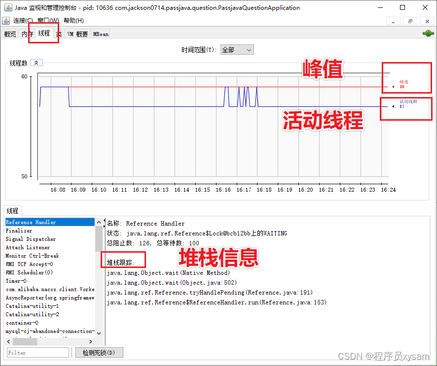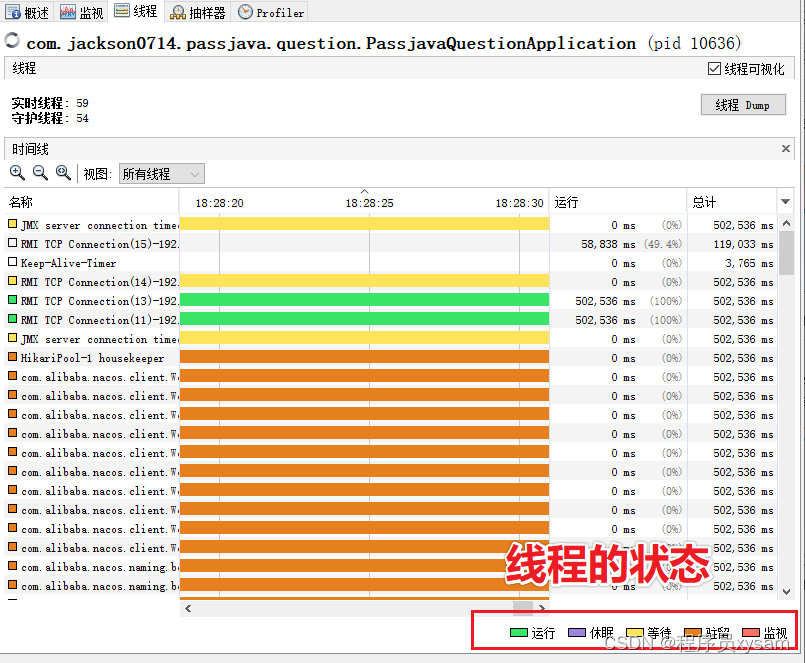 下面是线程的使用情况,可以看到线程峰值和活动线程的总数量,目前看到的峰值是59,活动线程数是 57。下半部分可以看到具体是哪些线程,以及线程的堆栈信息,非常详细。