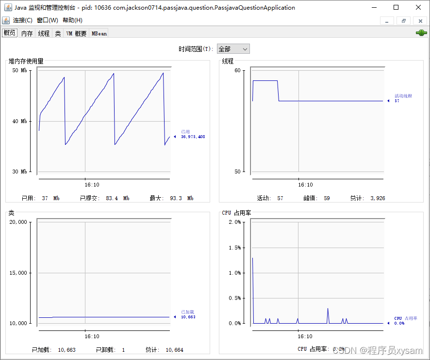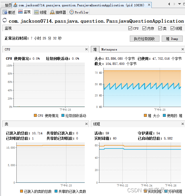 从监控界面上有 6 个菜单,首先看到的是概览功能,上面有堆内存使用量、线程数、类的使用情况、CPU 占用率,都是用趋势图来表示的,能很方便的看出当前性能的概览。注意:这些监控都是实时的。