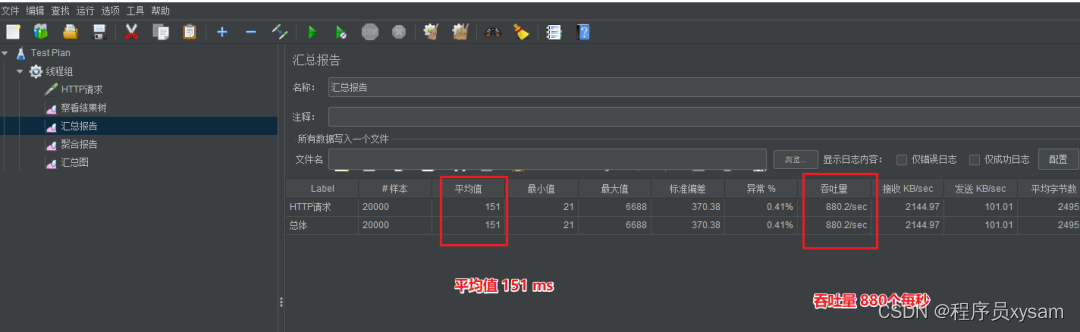 200 个线程,每个线程调用 100 次,总共 2 w 次,可以看到下图中表格中的样本列也是 2 w,请求所耗费的时间是 151 ms,吞吐量是 880 个请求每秒。如下图所示: