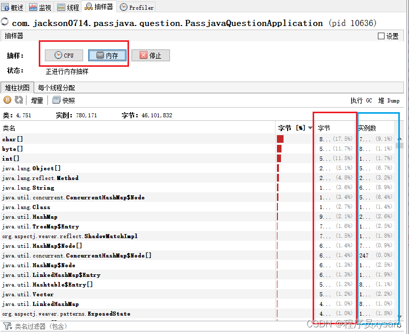 另外我们也可以抽样器对 CPU 或内存进行抽样。如下图所示,对内存进行抽样。