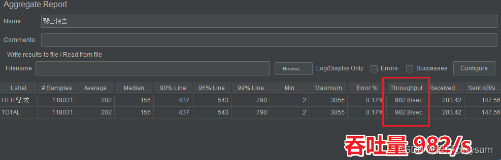 然后我们还是用 Jmeter 压测工具测试下 test api 的性能。测试结果如下图所示: