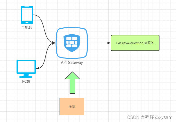 客户端分为手机端和 PC 端,http 请求先经过 API Gateway,然后再转发到 question 微服务。其中涉及到了中间件:Gateway 网关。
