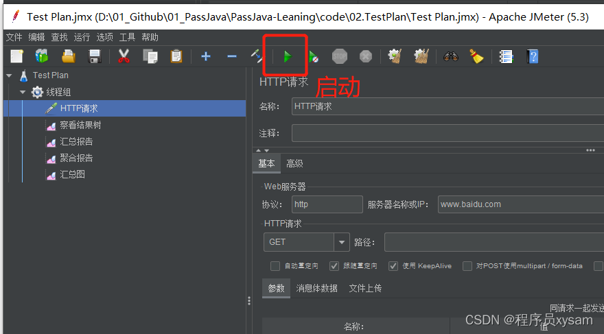点击播放按钮就开始启动了。注意启动之前需要先设置线程组的参数配置和 HTTP 请求的配置。如下图所示: