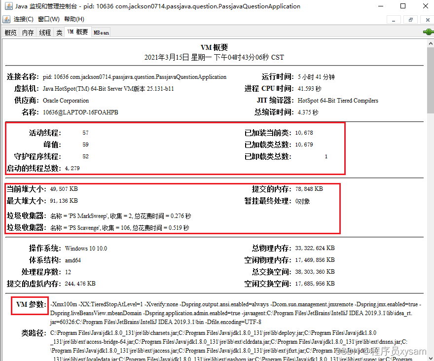 我们再来看下VM(虚拟机)的情况。如下图所示,可以看到虚拟机情况,线程、类、堆的概要信息,以及 VM 的参数,是不是很方便呀~