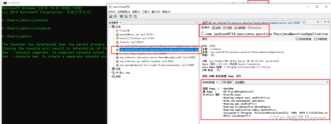 启动方式和 jconsole 一样,也是通过 cmd 命令行启动。还是选择 passjava-question 微服务,然后选择第一个菜单栏:概述。可以看到 JVM 的版本,启动参数等信息。