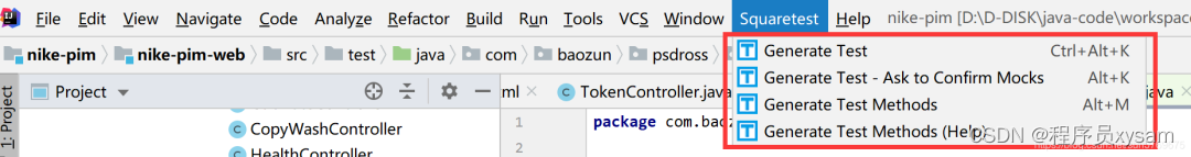 重启之后,菜单栏就多了一项Squaretest,下面我们来讲下怎么用,大家也可以通过看这个菜单的最后一项:Generate Test Methods(Help)来看它的一个演示,但演示不太全,我下面截图给大家看下我怎么用的,以及一些使用心得。