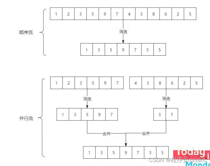 「stream和parallelStream的简单区分:」 stream是顺序流,由主线程按顺序对流执行操作,而parallelStream是并行流,内部以多线程并行执行的方式对流进行操作,但前提是流中的数据处理没有顺序要求。例如筛选集合中的奇数,两者的处理不同之处: