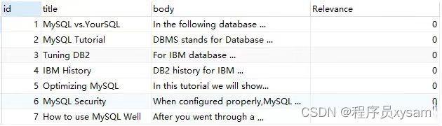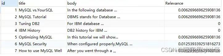 MATCH ( title, body ) against ( 'MySQL' ) AS Relevance