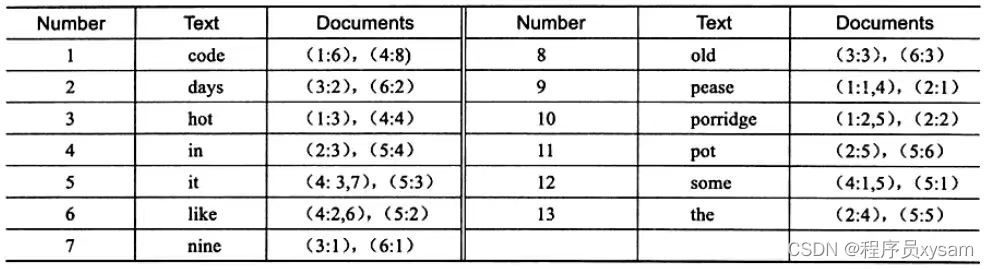 上图为 inverted file index 关联数组,可以看到其中单词"code"存在于文档1,4中,这样存储再进行全文查询就简单了,可以直接根据 Documents 得到包含查询关键字的文档;而 full inverted index 存储的是对,即(DocumentId,Position),因此其存储的倒排索引如下图,如关键字"code"存在于文档1的第6个单词和文档4的第8个单词。