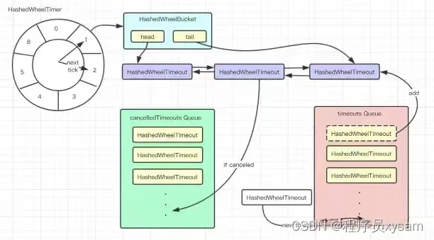 HashedWheelTimeOut: 延时任务载体,放于Bucket 数组中,属性有:前后指针,round 数等