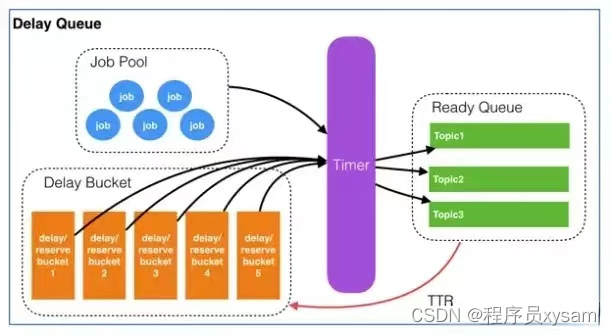 Timer: 实时扫描各个 Bucket,并将delay时间小于等于当前时间的job放入到对应的 Ready Queue。
