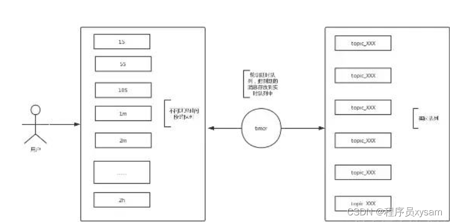 大致思路:借鉴 rocketMQ 延迟队列设计思想,创建多个topic 用于处理不同的延迟消息,例如延迟一分钟的任务消息,让 topic为 delay-minutes-1 进行处理。