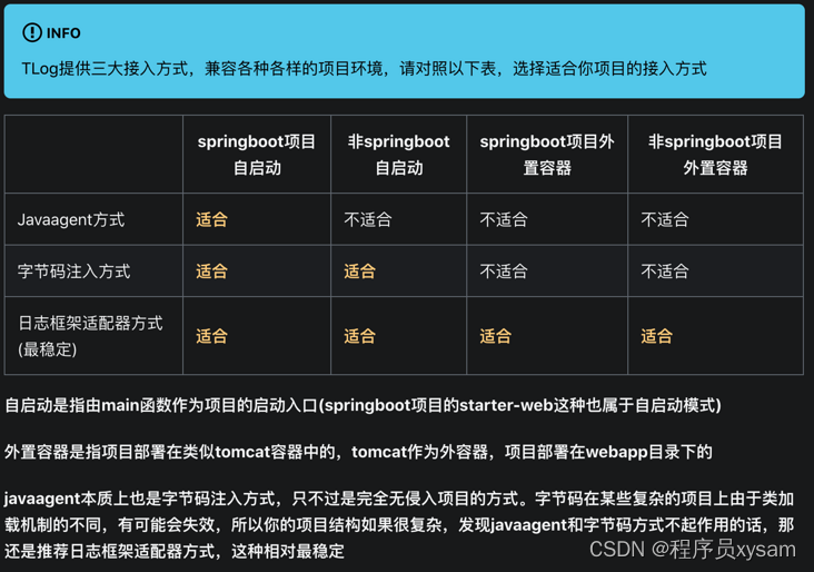 提供三种接入方式:javaagent 完全无侵入接入,字节码一行代码接入,基于配置文件的接入;