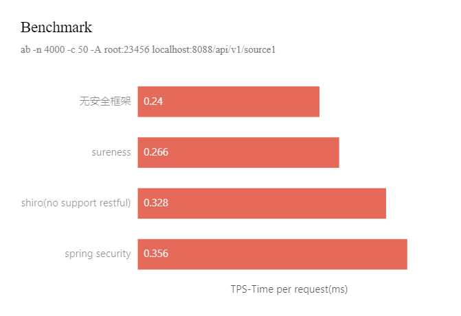 基准测试显示 Sureness 对比无权限框架应用损耗 0.026ms 性能,Shiro 损耗0.088ms、Spring Security 损耗 0.116ms。