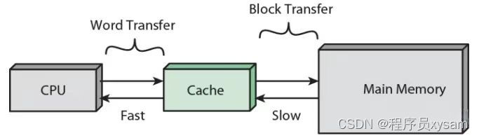 CPU 和 Cache 是 word 传输的,而 Cache 到主存是以块传输的,一块大约 64Byte 。