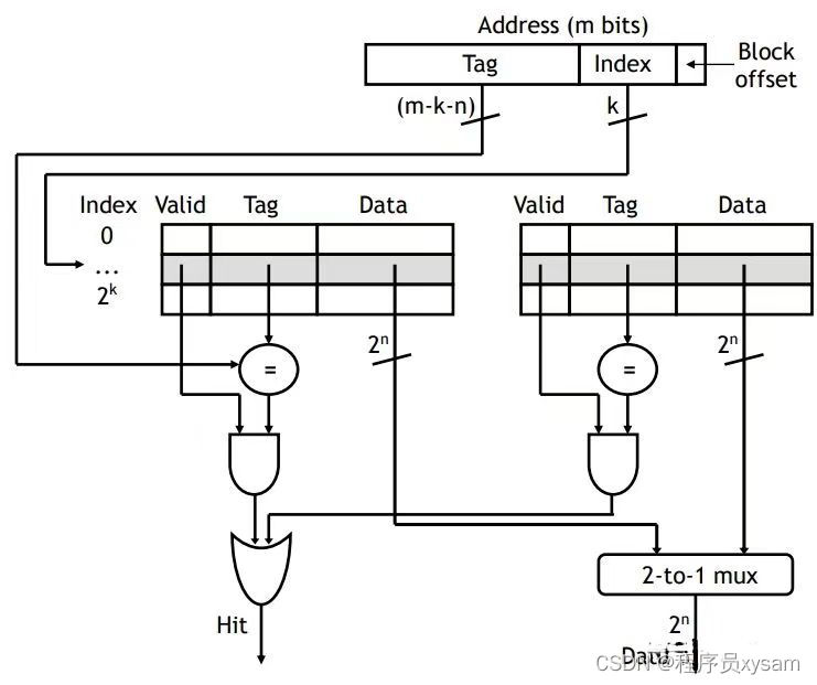 如上图所示。用index选出位于组相连的哪个组。然后并行的比较Tag, 判断最后是不是在Cache中。上图是2路组相连,也就是说两组并行比较。