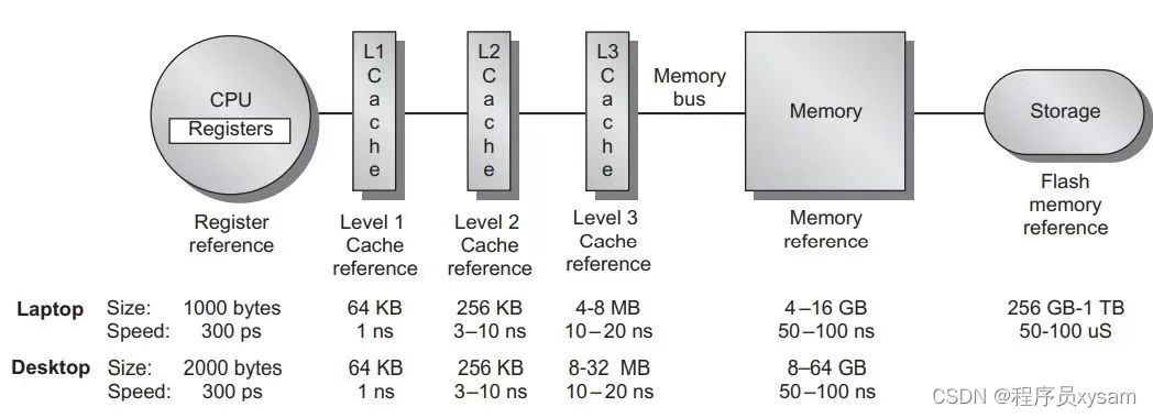 如上图所示,整个系统的存储架构包括了 CPU 的寄存器,L1/L2/L3 CACHE,DRAM 和硬盘。