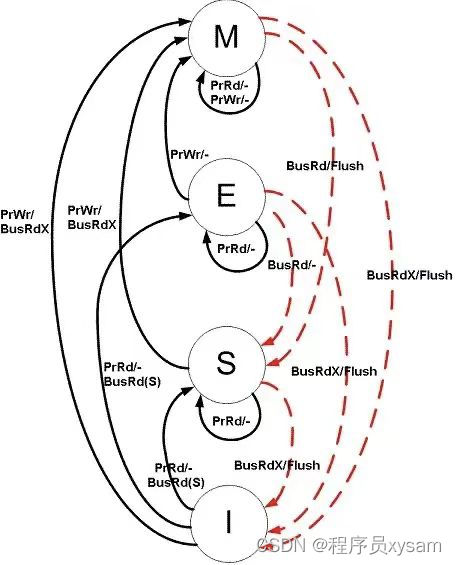 我们着重讲讲 MESI。图中黑线:CPU的访问。红线:总线的访问,其他Cache的访问。