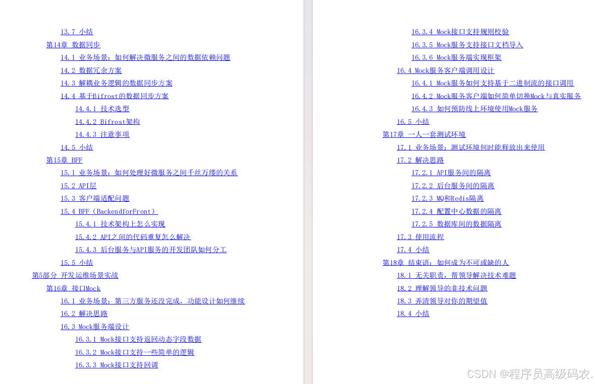 • 第5部分:开发运维场景实战。主要讲解如何通过一些架构上的设计来 提高开发效率和测试微服务的效率。