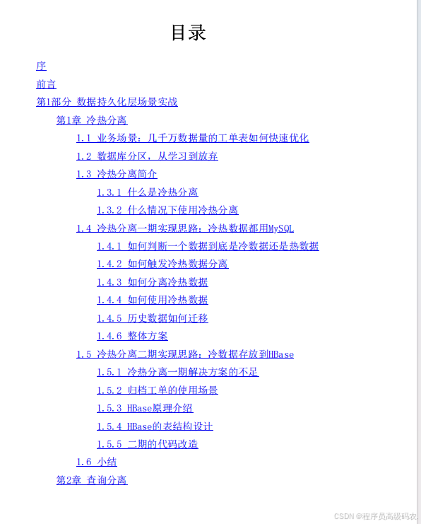 • 第1部分:数据持久化层场景实战。主要讲解存储的数据量太大影响读 写性能时,如何在存储层采取措施来解决性能问题。学完这部分内容后,当 遇到数据量大的问题时,就可以直接从中找到参考答案。
