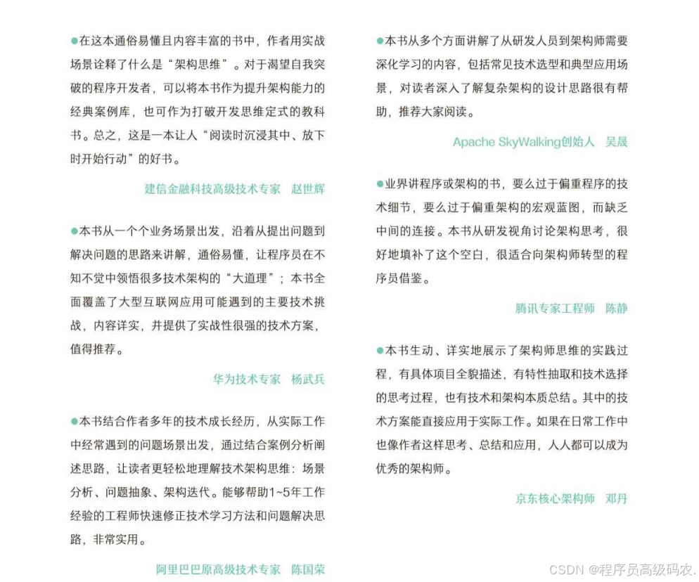本书将结合16次真实架构经历,完整、具体地将架构设计过程呈现出 来,在通过各种场景帮你巩固架构实现原理和设计知识的同时,也是一种架 构经历的丰富。看完本书后,你不仅可以更加自信地去争取更多解决架构问 题的机会,面试架构师的成功率也会高一些,离架构师这个目标职位也就越 来越近。