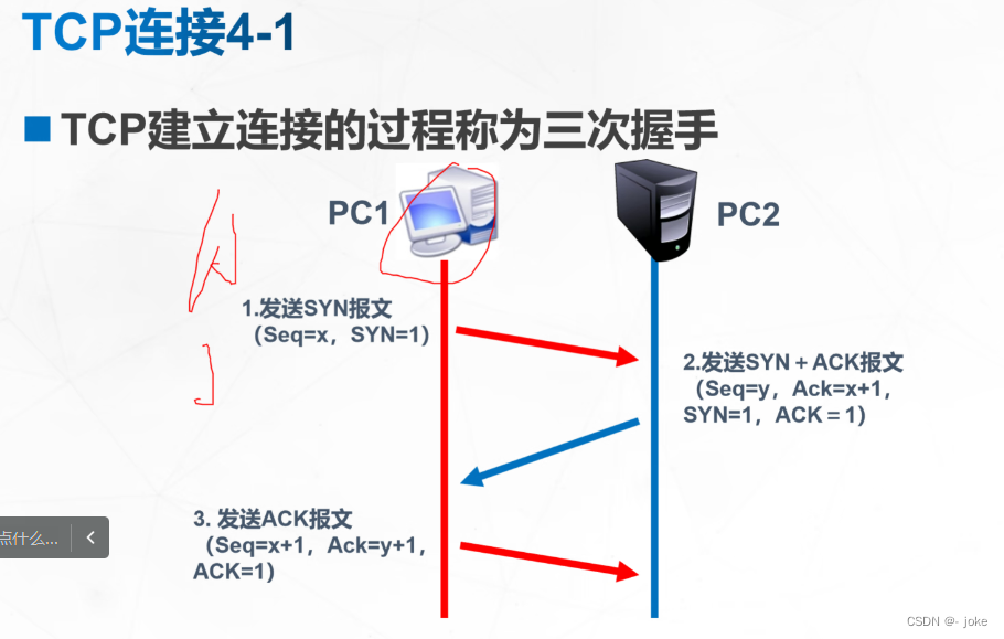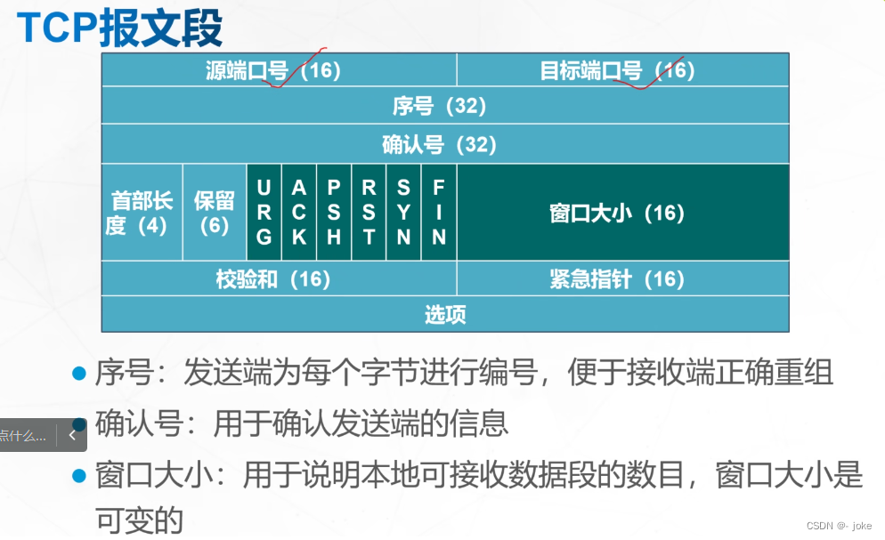 SYN:同步位,连接位,同步序号的位置,tcp需要建立连接时,SYN=1建立连接