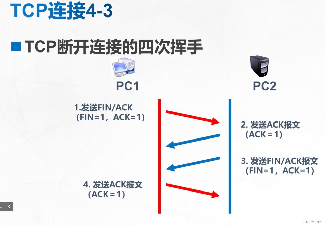一方先发送FIN=1,这时候表示不再发送数据,但是接收数据不受影响,另一方回应ACK=1,告诉对方,确认发送方不发数据,但是接收方还要继续传输数据。接收方传完数据,就进入最后的回收阶段