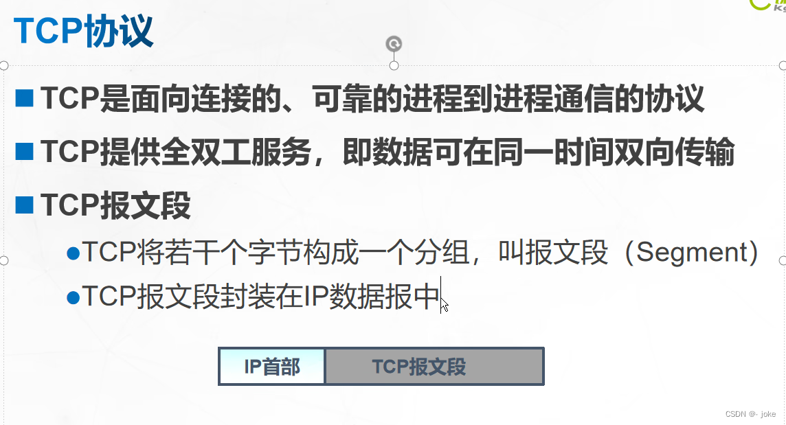 TCP传输协议:面对链接的,可靠的进程到进程的通信协议。TCP提供的全双工服务,数据可以在同一时间双向传输。