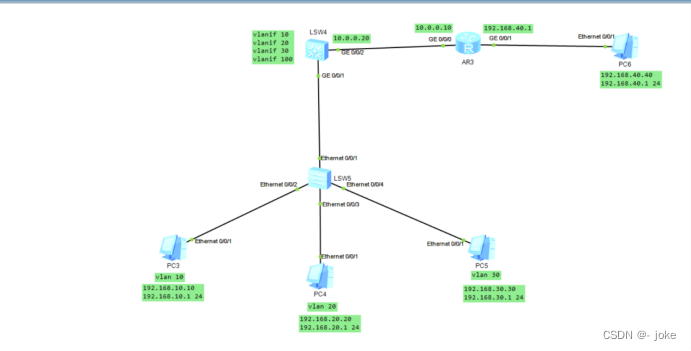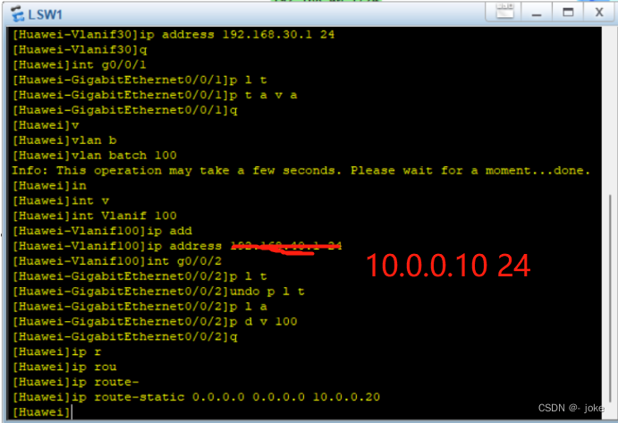 三层交换机看作是路由器,交换机一体,所以需要做网关地址 交换机不可以做ip地址所以需要int vlanif 10--->ip address用来做接口转发的,意思是vlan 10这条线ip地址