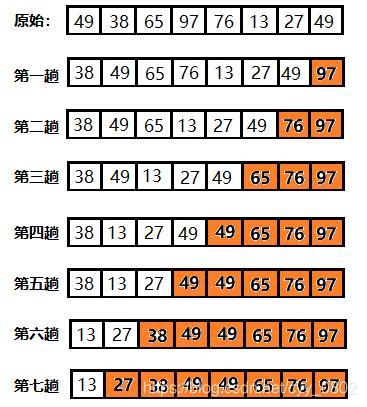 就是像是水泡从池底网上冒或者是一个石块往下沉的情况类似。相邻元素之间两两比较,大的往后放,第一次完毕之后,最大值就被找到。