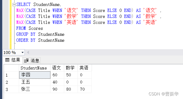 MAX(CASE Title WHEN '语文' THEN Score ELSE 0 END) AS '语文' ,