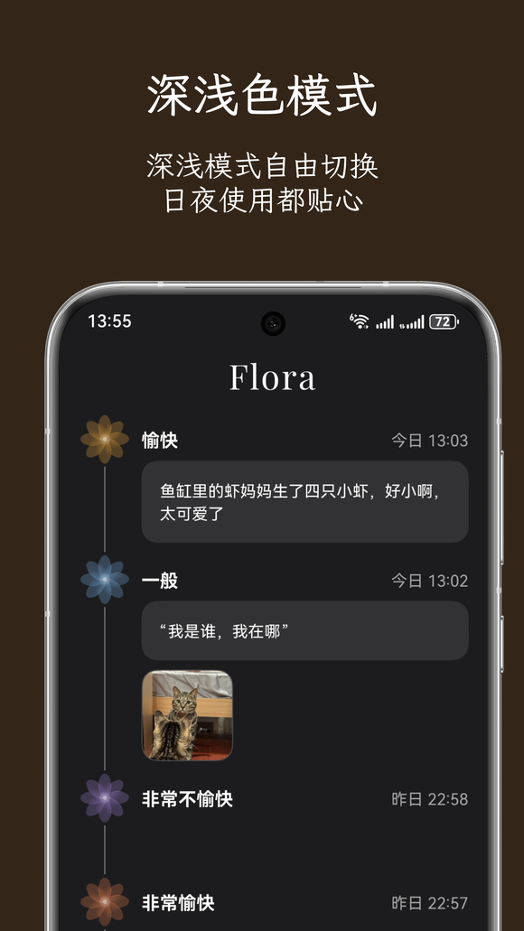 因此,在 Flora 的设计中,我们做了一个反常规的决定:去数值化。 我们设计了一套基于直觉的“花朵”交互体系。用户不需要定义心情的分数,只需选择一种色彩来承载当下的感受。所有记录下来的瞬间,会汇成一条属于用户的心情小径。它只关乎回顾,无关评判。