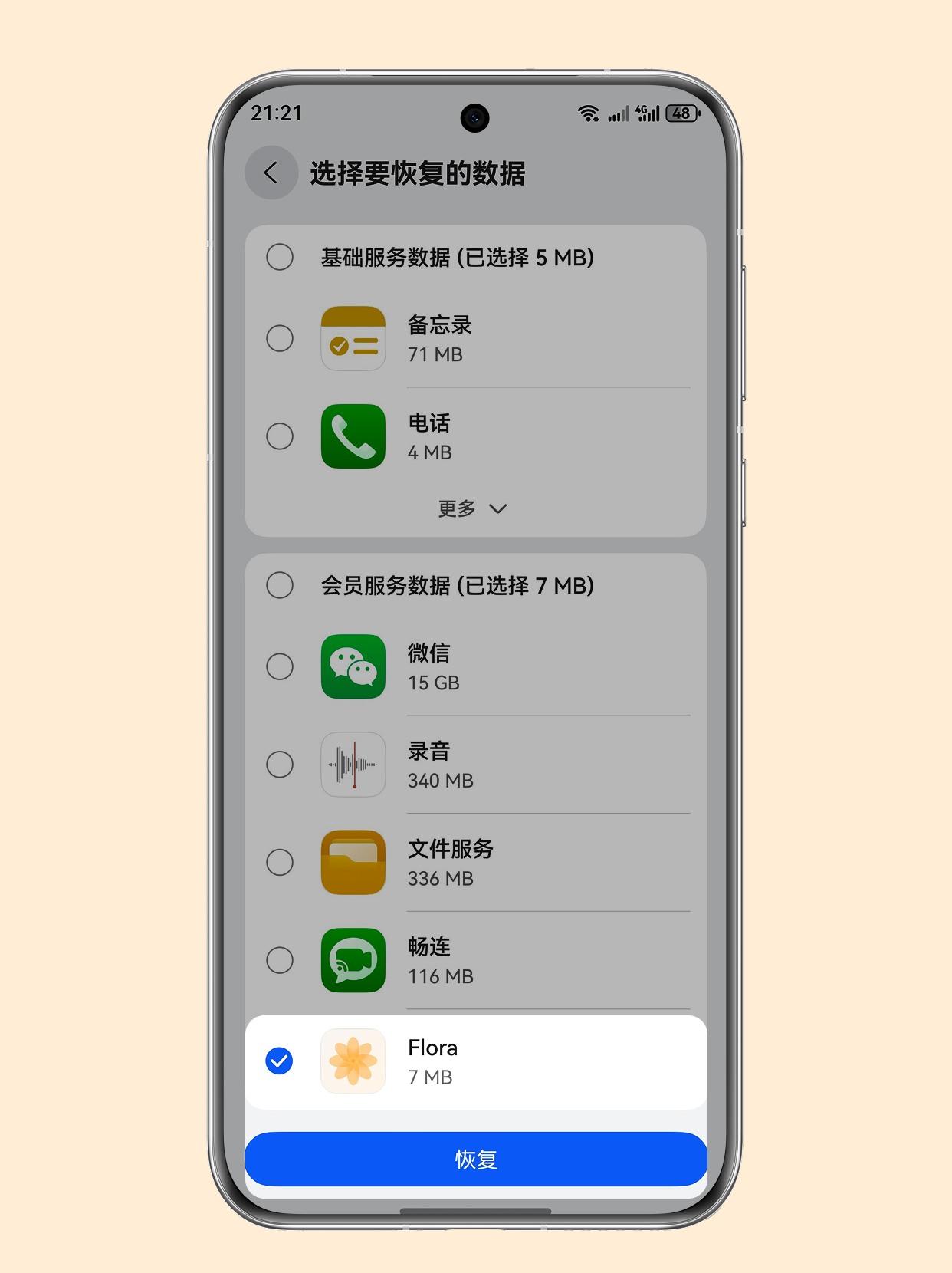 当你选择从云备份恢复数据时,系统会将 Flora 在该时间点的数据包完整覆盖当前设备上的数据。