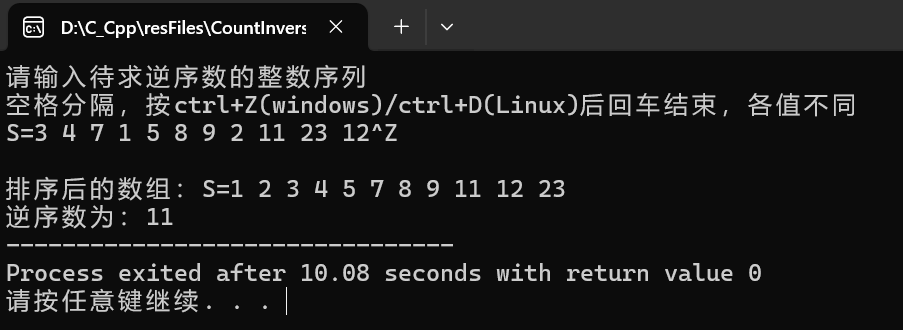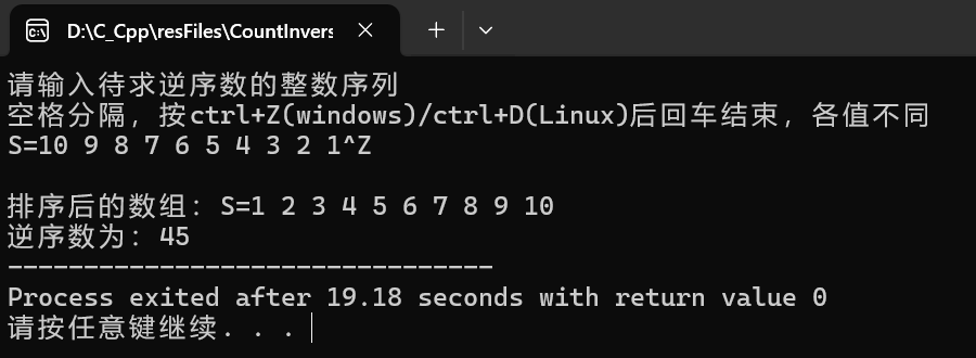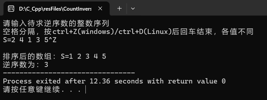 cout<<"请输入待求逆序数的整数序列"<<endl<<"空格分隔,按ctrl+Z(windows)/ctrl+D(Linux)后回车结束,各值不同"<<endl<<"S=";// 输入序列S