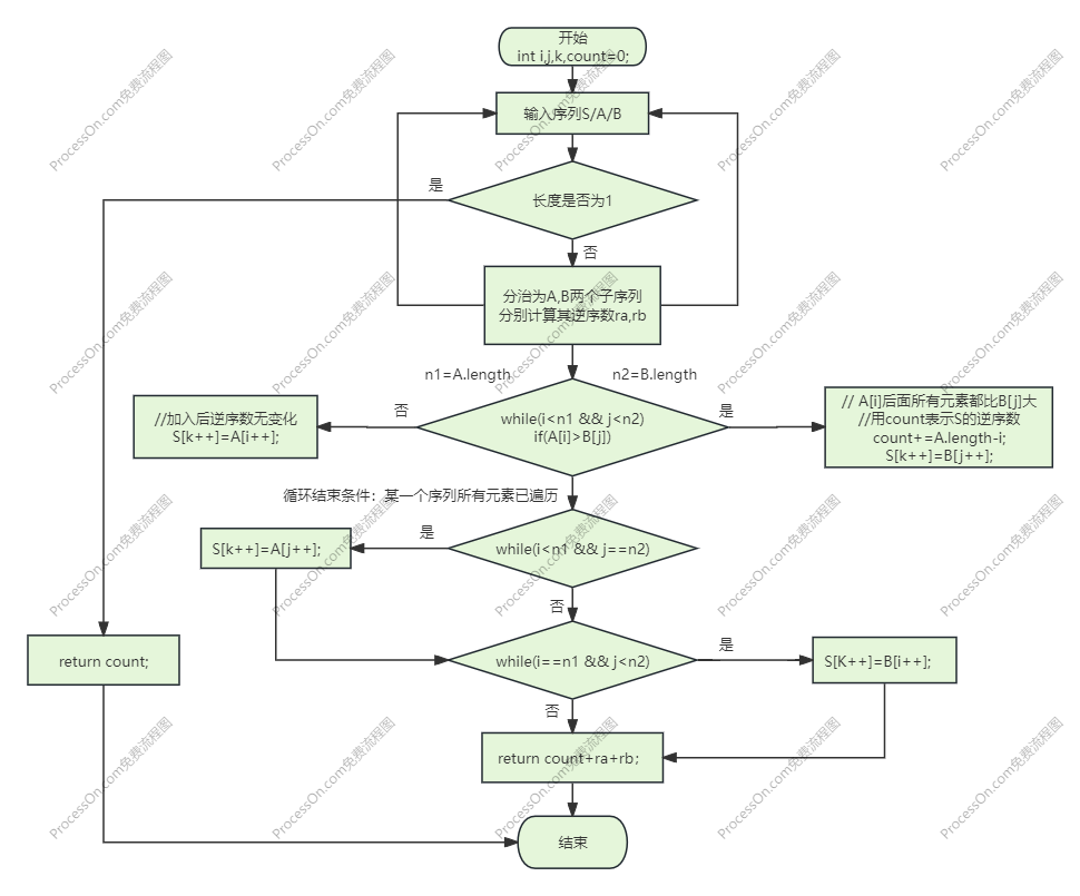 count += MergeAndCount(S,left,mid,right);// A、B有序序列合并
