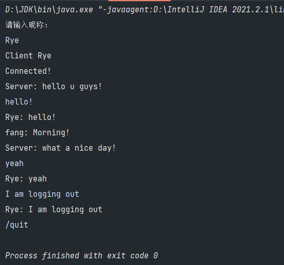 在服务器端接收到某个客户端的消息后,还会将其进行转发,发送至每一个客户端,是的所有客户端之间能看见互相发送的消息。同时,为客户端和服务器端设立退出关键字“/quit”,输入“/quit”之后,客户端会关闭socket,结束程序,客户端下线;服务器端则会关闭所有socket,使得所有客户端也被迫退出通信。如果所有客户端均退出,服务器端自动关闭。