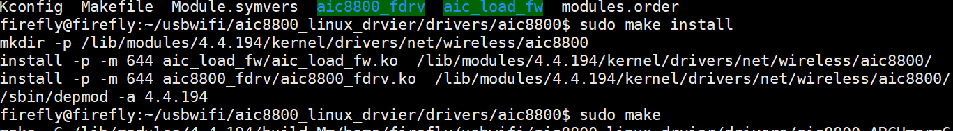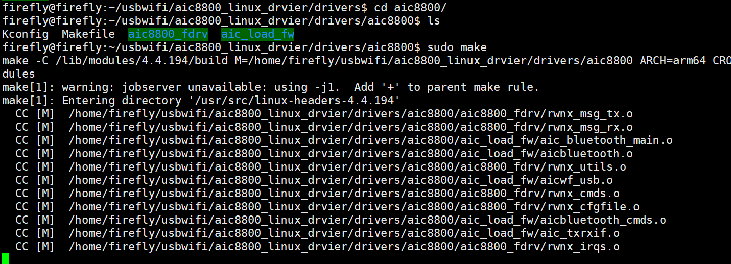 1、进入/usbwifi/aic8800_linux_drvier/drivers/aic8800/目录,执行sudo make进行编译。