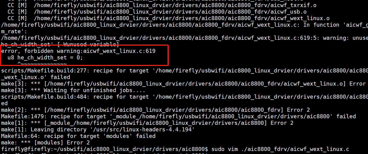 2、编译过程中存在warning导致编译失败,原因为在aicwf_wext_linux.c:619处存在声明却未使用变量,手动屏蔽该变量重新编译。