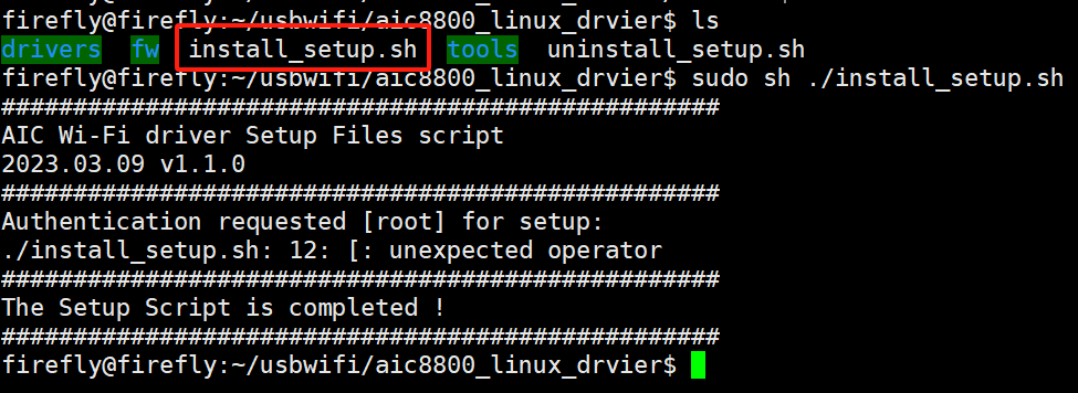 4、进入该目录下:/usbwifi/aic8800_linux_drvier/, 执行 sudo sh ./install_setup.sh,执行完成后驱动安装成功。