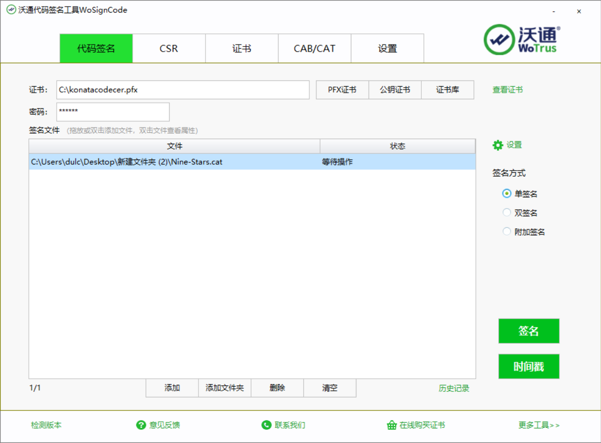 跳转到“代码签名”页面,点击“PFX证书”,选择生成到C盘的konatacodecer.pfx文件,输入密码:mypass。点击“签名”按钮。