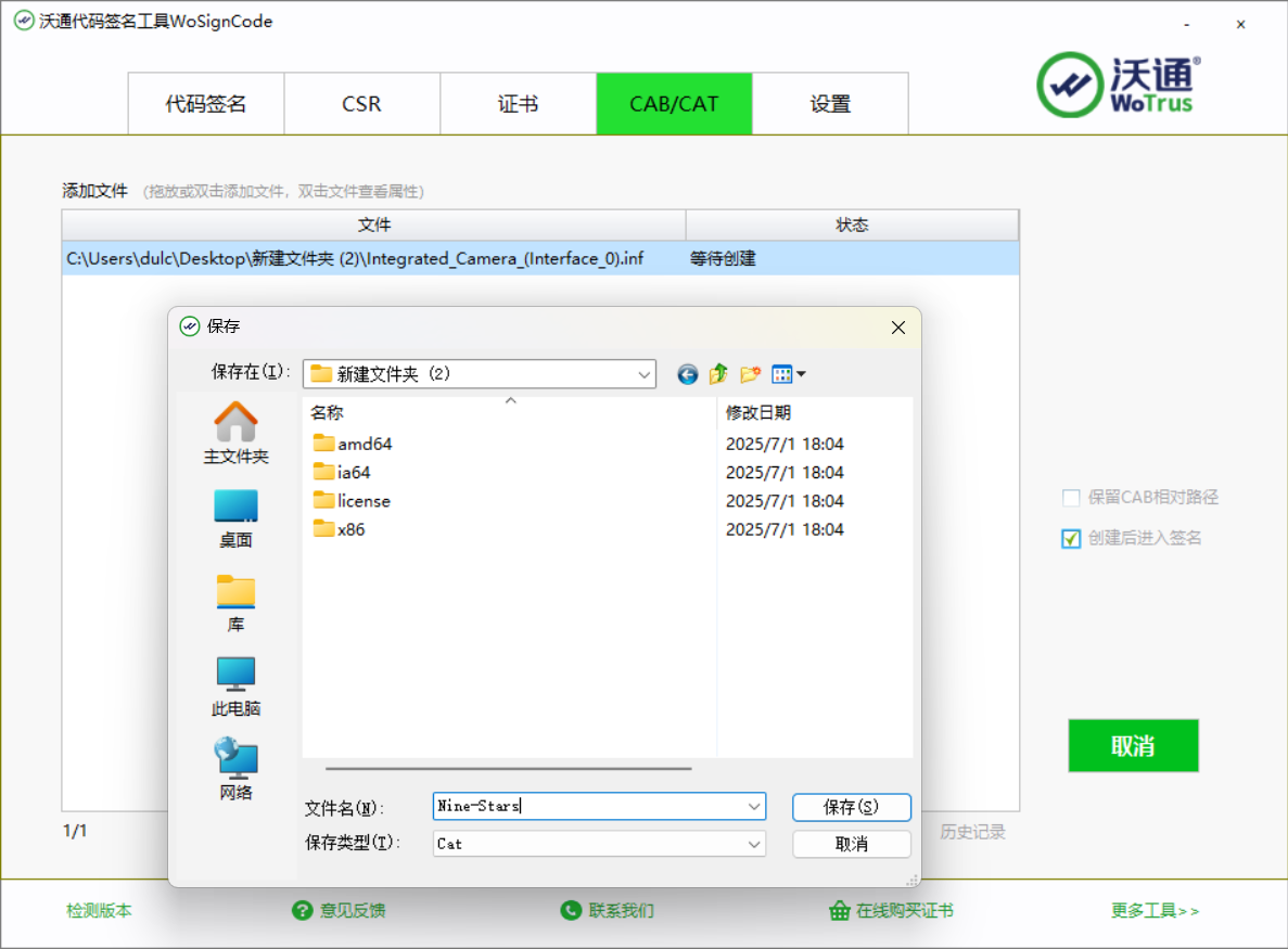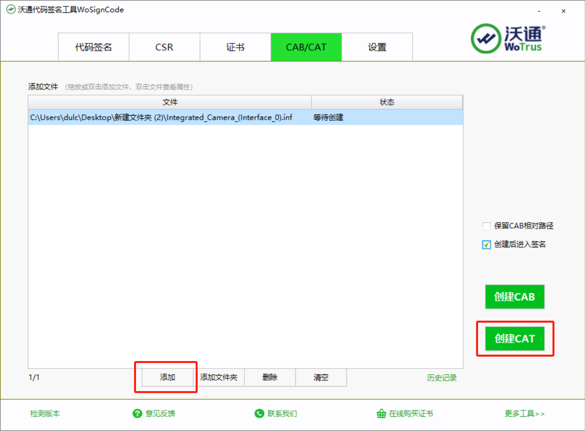 打开wosigncode.exe软件,点击“CAB/CAT”,选择添加驱动文件,选择好后点击“创建CAT”开始创建,选择创建的目录当前驱动文件inf同目录下。