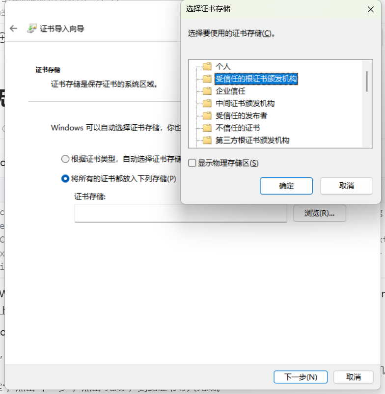 右键,安装konatacodecer.pfx文件,选择”本地计算机“-->”下一步“-->”下一步“,输入密码:mypass,下一步,选择”将所有的证书都放入下列存储“,点击”浏览“,选择”受信任的根证书颁发机构“,点击”确定“,点击”下一步“,点击”完成“,到此证书导入完成。