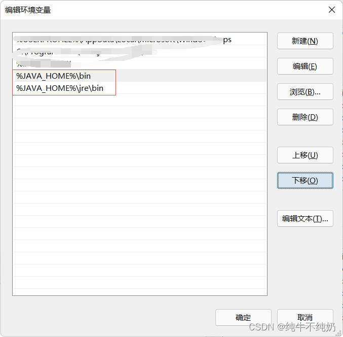4.在用户变量中,选择Path,点击编辑,在弹出的框中选择新建添加2行,一行输入%JAVA_HOME%\bin,一行输入%JAVA_HOME%\jre\bin