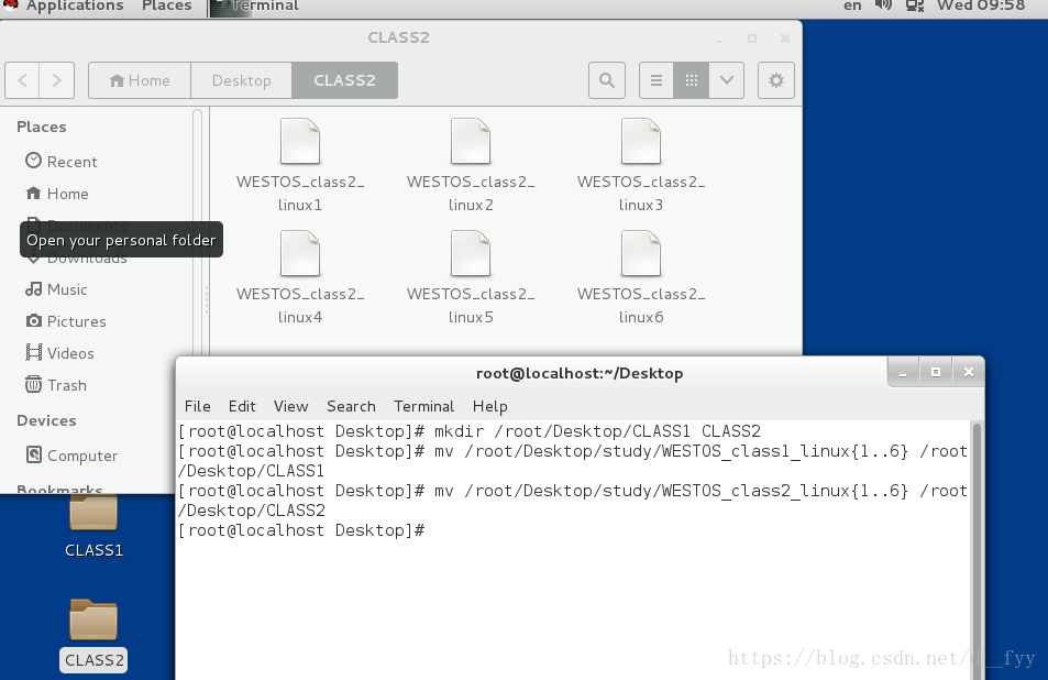 6.用一条命令把 WESTOS_classX_linuxY 中 class2 的文件移动到当前用户桌面的 CLASS2 中