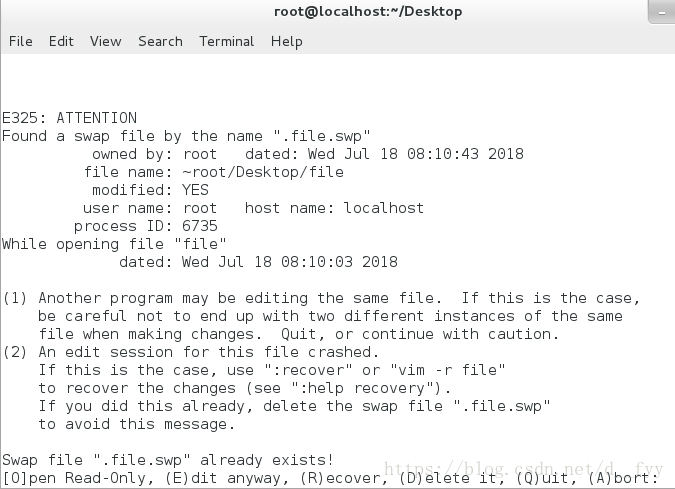 当vim异常退出时会生成.file.swp文件,当再次打开此文件时会出现以下情况:
