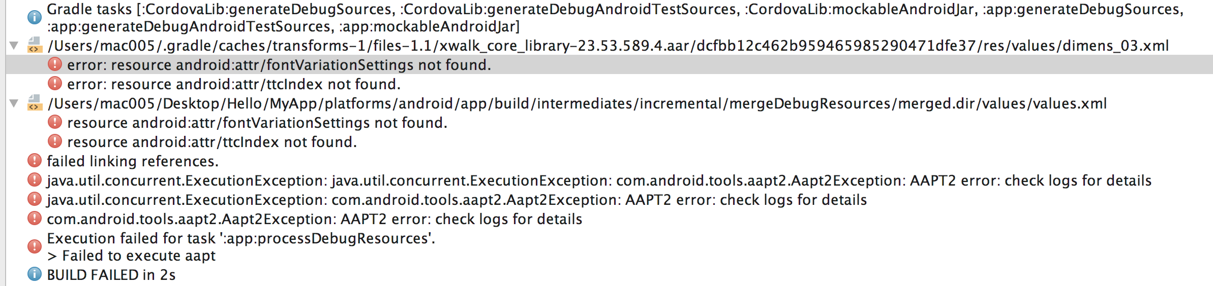 最后发现原来是因为android support library互相不兼容导致的,这些support library的版本不一致,导致项目中Crosswalk插件里面报了android:attr/fontVariationSettings not found等等这些错误,好了找到问题解决就快了:让这些support library强制统一版本就OK啦